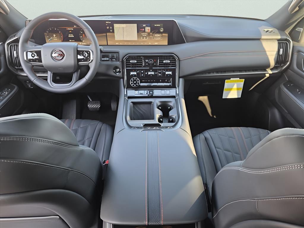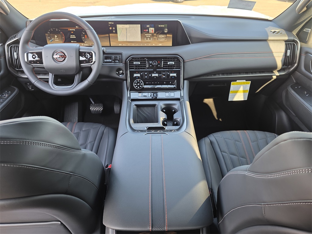 Pro-4X Package, 4WD, 12 Speakers, 3rd row seats: split-bench, 4-Wheel Disc Brakes, ABS brakes, Adaptive suspension, Air Conditioning, Alloy wheels, AM/FM radio: SiriusXM, Anti-whiplash front head restraints, Auto High-beam Headlights, Auto tilt-away steering wheel, Auto-dimming door mirrors, Auto-dimming Rear-View mirror, Auto-leveling suspension, Automatic temperature control, Brake assist, Bumpers: body-color, Delay-off headlights, Driver door bin, Driver vanity mirror, Dual front impact airbags, Dual front side impact airbags, Electronic Stability Control, Emergency communication system: NissanConnect Services, Four wheel independent suspension, Front anti-roll bar, Front Bucket Seats, Front Center Armrest, Front dual zone A/C, Front fog lights, Front reading lights, Fully automatic headlights, Garage door transmitter: myQ Connected Garage, Genuine wood dashboard insert, Heated door mirrors, Heated Front Bucket Seats, Heated front seats, Heated steering wheel, HVAC memory, Illuminated entry, Knee airbag, Leather steering wheel, Low tire pressure warning, Memory seat, Navigation System, Occupant sensing airbag, Outside temperature display, Overhead airbag, Overhead console, Panic alarm, Passenger door bin, Passenger vanity mirror, Power door mirrors, Power driver seat, Power Liftgate, Power passenger seat, Power steering, Power windows, Premium Paint, PRO-4X Carpeted Floor Mats, PRO-4X Mud Guards, PRO-4X Unique Quilted Leather Seat Trim, Radio: NissanConnect w/SiriusXM 360L, Rain sensing wipers, Rear air conditioning, Rear anti-roll bar, Rear Bumper Protector, Rear reading lights, Rear seat center armrest, Rear window defroster, Rear window wiper, Reclining 3rd row seat, Remote keyless entry, Roof Rail Cross Bars, Security system, Speed control, Speed-sensing steering, Speed-Sensitive Wipers, Split folding rear seat, Spoiler, Steering wheel memory, Steering wheel mounted audio controls, Tachometer, Telescoping steering wheel, Tilt steering wheel, Traction control, Trip computer, Turn signal indicator mirrors, Variably intermittent wipers, Voltmeter, Wheels: 20" Painted PRO-4X Alloy.