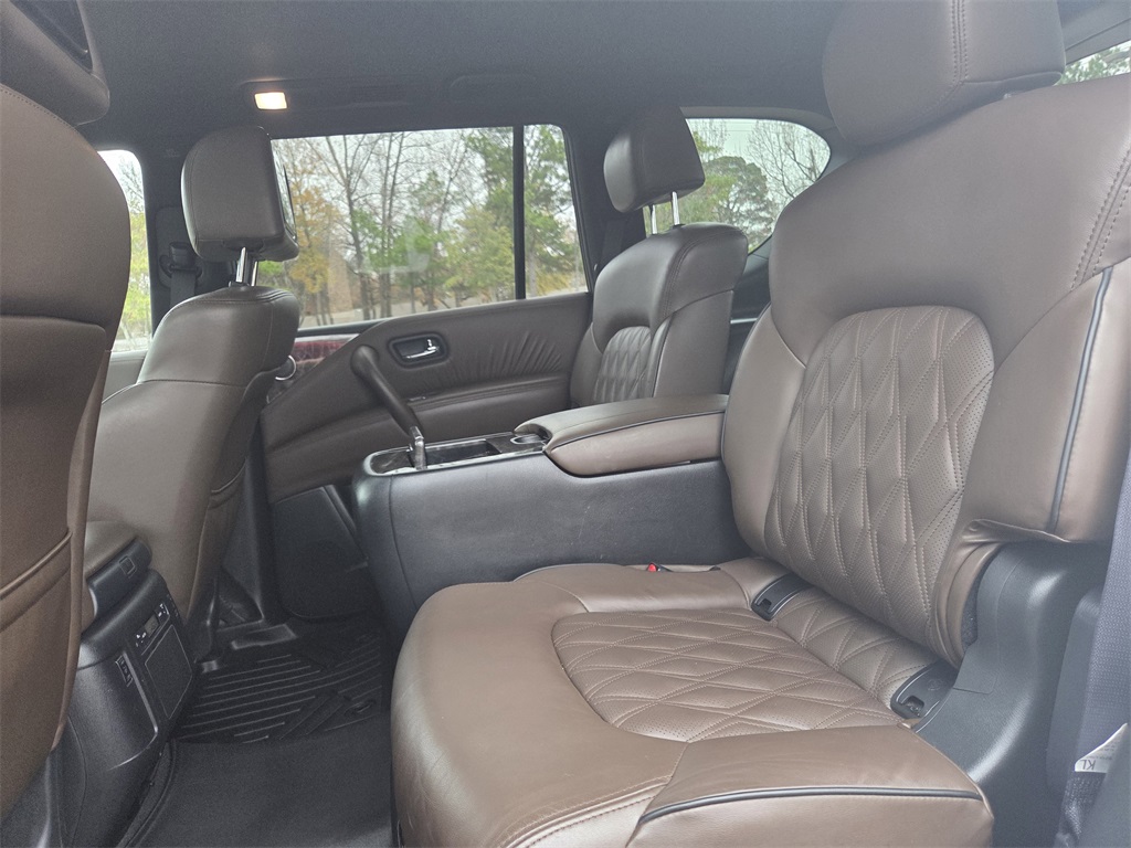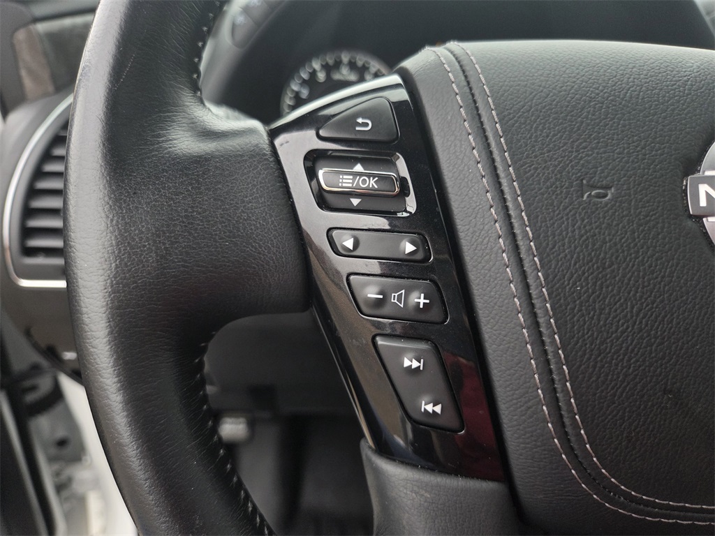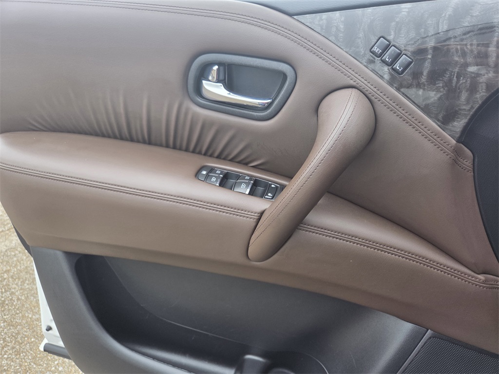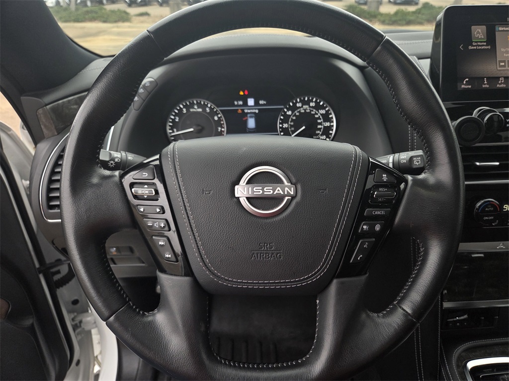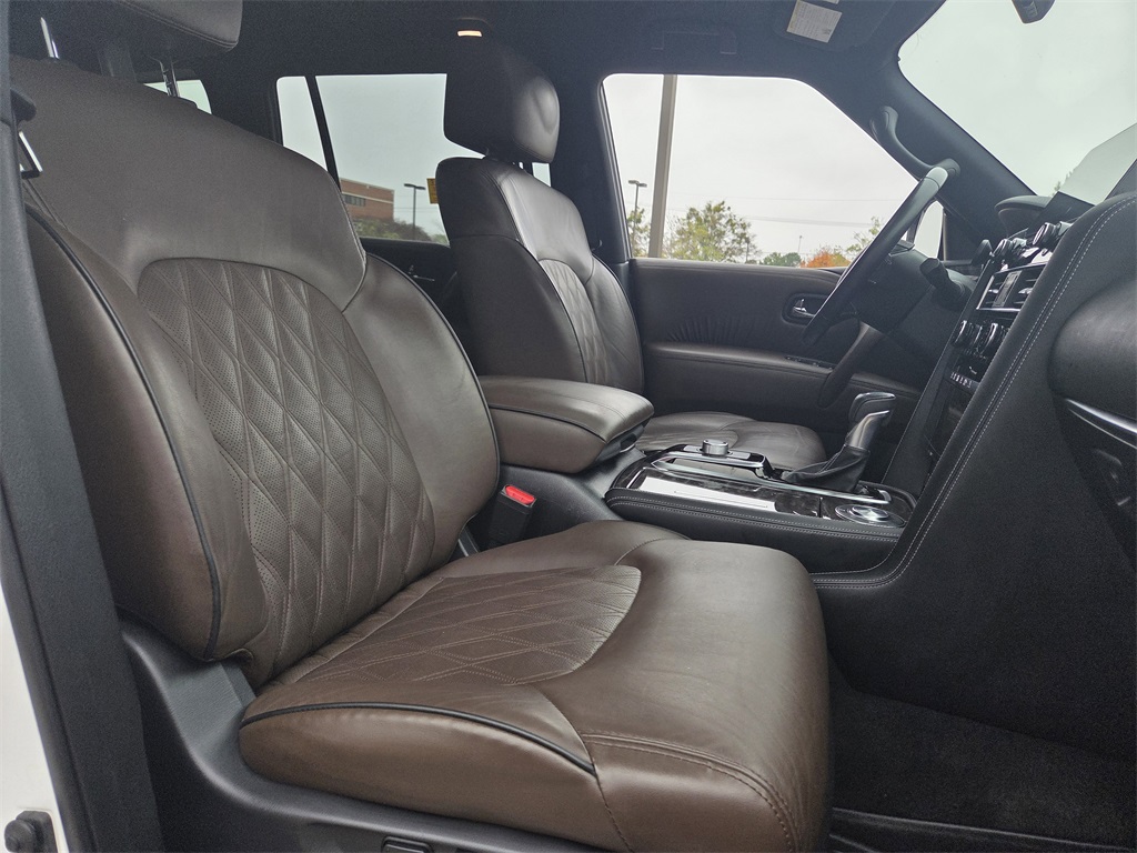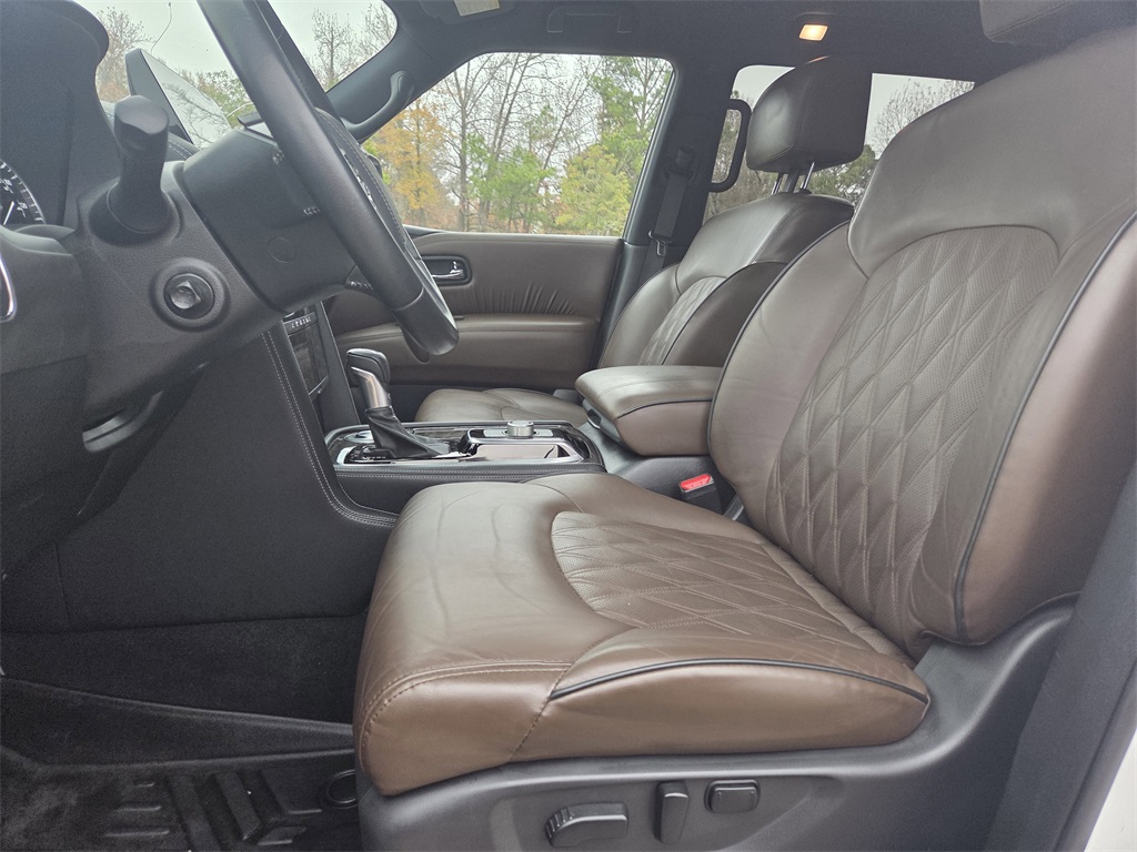One Owner Trade, Platinum Package, 13 Speakers, 2.94 Axle Ratio, 2nd Row Captain's Chairs, 2nd Row Center Console w/Padded Armrest, 3rd Row Carpeted Floor Mats - Captain Seat, 3rd row seats: split-bench, 4-Wheel Disc Brakes, ABS brakes, Air Conditioning, Alloy wheels, AM/FM radio: SiriusXM, Anti-whiplash front head restraints, Auto High-beam Headlights, Auto tilt-away steering wheel, Auto-dimming door mirrors, Auto-dimming Rear-View mirror, Auto-leveling suspension, Automatic temperature control, Brake assist, Bumpers: body-color, Captain's Chairs Package, Climate-Controlled Front Bucket Seats, Cross Bars, Delay-off headlights, Driver door bin, Driver vanity mirror, Dual front impact airbags, Dual front side impact airbags, Electronic Stability Control, Emergency communication system: NissanConnect Services, Exterior Parking Camera Rear, Four wheel independent suspension, Front anti-roll bar, Front Bucket Seats, Front Center Armrest, Front dual zone A/C, Front fog lights, Front reading lights, Fully automatic headlights, Garage door transmitter: HomeLink, Heated door mirrors, Heated front seats, Heated rear seats, Heated steering wheel, Illuminated entry, Illuminated Kick Plates, Leather Shift Knob, Low tire pressure warning, Memory seat, Navigation System, NissanConnect featuring Apple CarPlay and Android Auto, Occupant sensing airbag, Outside temperature display, Overhead airbag, Overhead console, Panic alarm, Passenger door bin, Passenger vanity mirror, Power door mirrors, Power driver seat, Power Liftgate, Power moonroof, Power passenger seat, Power steering, Power windows, Quilted Leather Seat Trim, Radio: NissanConnect w/SiriusXM, Rain sensing wipers, Rear air conditioning, Rear anti-roll bar, Rear reading lights, Rear seat center armrest, Rear window defroster, Rear window wiper, Reclining 3rd row seat, Remote keyless entry, Security system, Special Paint - Aspen White, Speed control, Speed-sensing steering, Speed-Sensitive Wipers, Split folding rear seat, Spoiler, Steering wheel memory, Steering wheel mounted audio controls, Tachometer, Telescoping steering wheel, Tilt steering wheel, Traction control, Trip computer, Turn signal indicator mirrors, Variably intermittent wipers, Ventilated front seats, Voltmeter, Welcome Lighting, Wheels: 22" Machine-Faced w/Tinted Clear Coat.