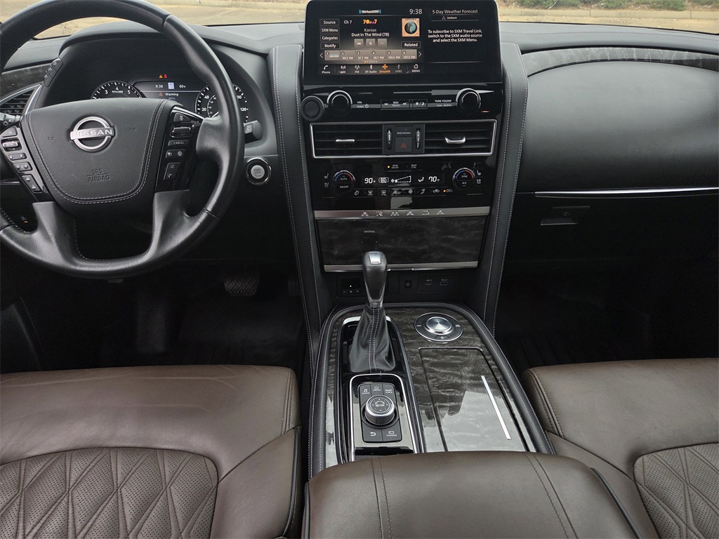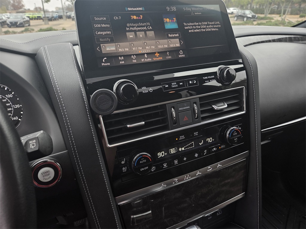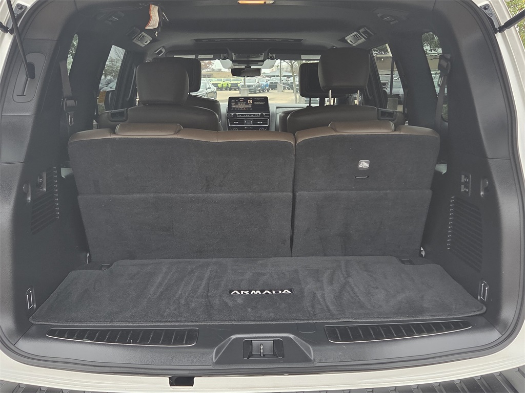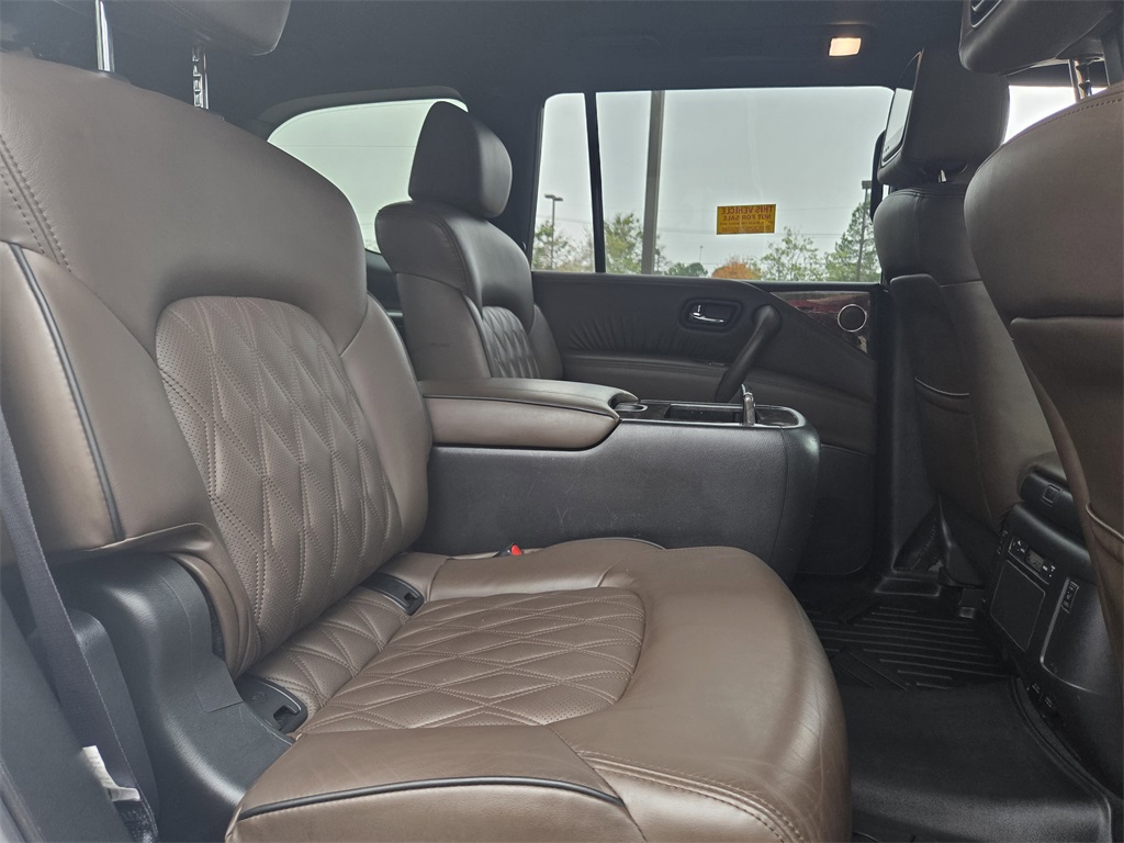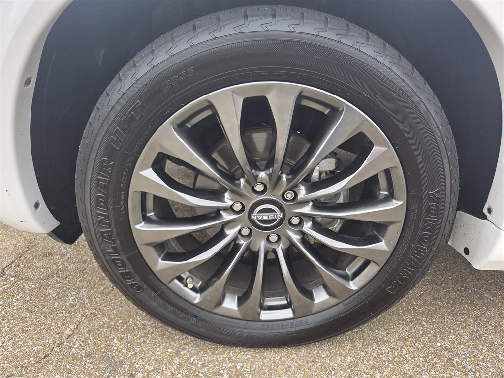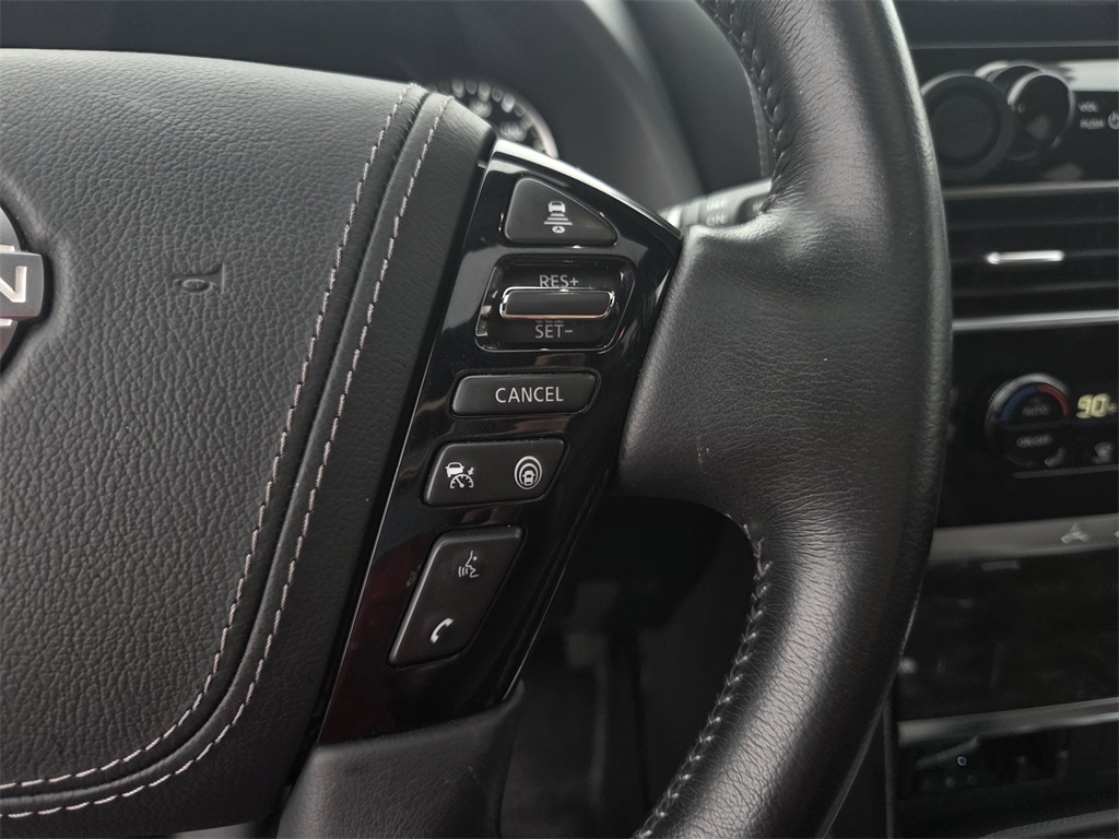 One Owner Trade, Platinum Package, 13 Speakers, 2.94 Axle Ratio, 2nd Row Captain's Chairs, 2nd Row Center Console w/Padded Armrest, 3rd Row Carpeted Floor Mats - Captain Seat, 3rd row seats: split-bench, 4-Wheel Disc Brakes, ABS brakes, Air Conditioning, Alloy wheels, AM/FM radio: SiriusXM, Anti-whiplash front head restraints, Auto High-beam Headlights, Auto tilt-away steering wheel, Auto-dimming door mirrors, Auto-dimming Rear-View mirror, Auto-leveling suspension, Automatic temperature control, Brake assist, Bumpers: body-color, Captain's Chairs Package, Climate-Controlled Front Bucket Seats, Cross Bars, Delay-off headlights, Driver door bin, Driver vanity mirror, Dual front impact airbags, Dual front side impact airbags, Electronic Stability Control, Emergency communication system: NissanConnect Services, Exterior Parking Camera Rear, Four wheel independent suspension, Front anti-roll bar, Front Bucket Seats, Front Center Armrest, Front dual zone A/C, Front fog lights, Front reading lights, Fully automatic headlights, Garage door transmitter: HomeLink, Heated door mirrors, Heated front seats, Heated rear seats, Heated steering wheel, Illuminated entry, Illuminated Kick Plates, Leather Shift Knob, Low tire pressure warning, Memory seat, Navigation System, NissanConnect featuring Apple CarPlay and Android Auto, Occupant sensing airbag, Outside temperature display, Overhead airbag, Overhead console, Panic alarm, Passenger door bin, Passenger vanity mirror, Power door mirrors, Power driver seat, Power Liftgate, Power moonroof, Power passenger seat, Power steering, Power windows, Quilted Leather Seat Trim, Radio: NissanConnect w/SiriusXM, Rain sensing wipers, Rear air conditioning, Rear anti-roll bar, Rear reading lights, Rear seat center armrest, Rear window defroster, Rear window wiper, Reclining 3rd row seat, Remote keyless entry, Security system, Special Paint - Aspen White, Speed control, Speed-sensing steering, Speed-Sensitive Wipers, Split folding rear seat, Spoiler, Steering wheel memory, Steering wheel mounted audio controls, Tachometer, Telescoping steering wheel, Tilt steering wheel, Traction control, Trip computer, Turn signal indicator mirrors, Variably intermittent wipers, Ventilated front seats, Voltmeter, Welcome Lighting, Wheels: 22" Machine-Faced w/Tinted Clear Coat.