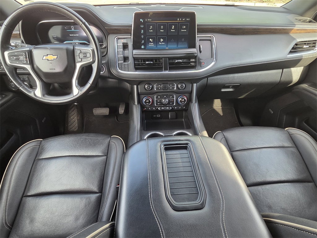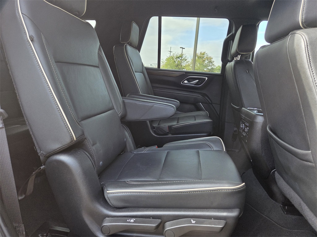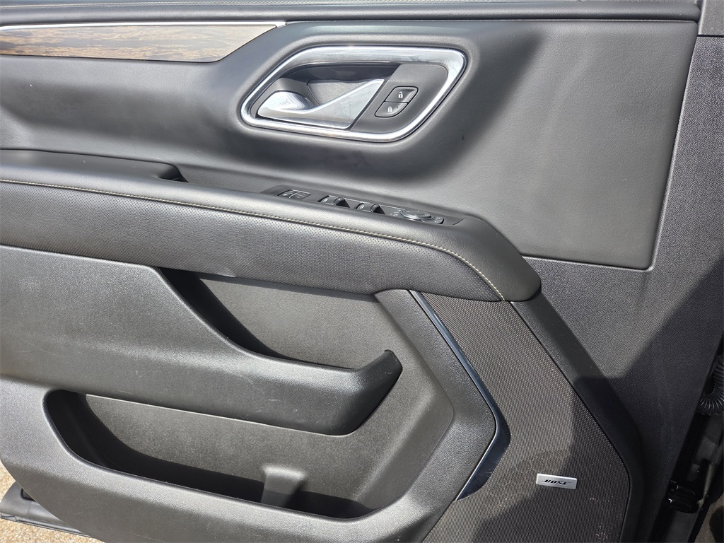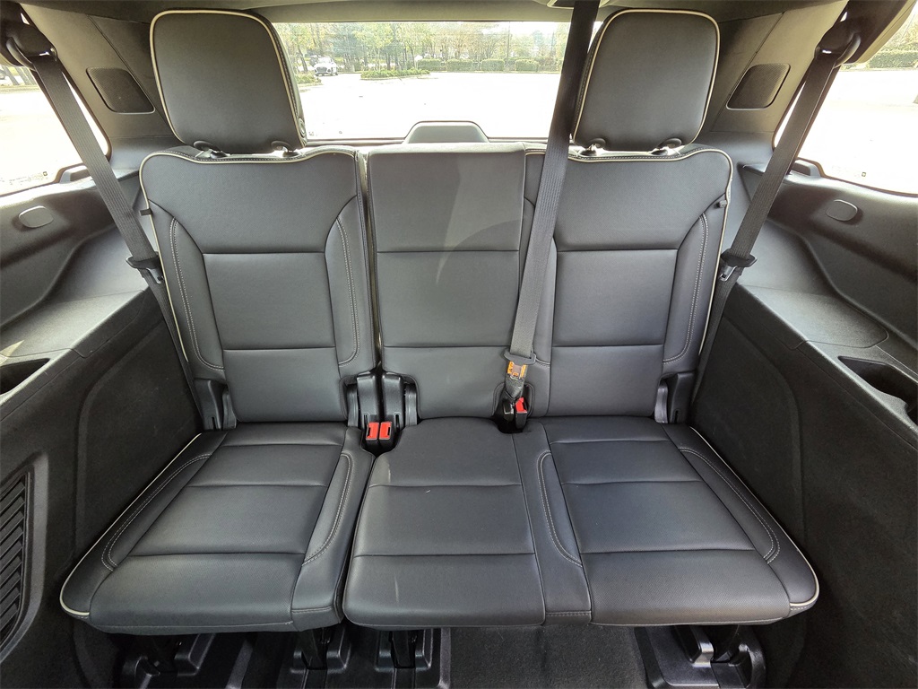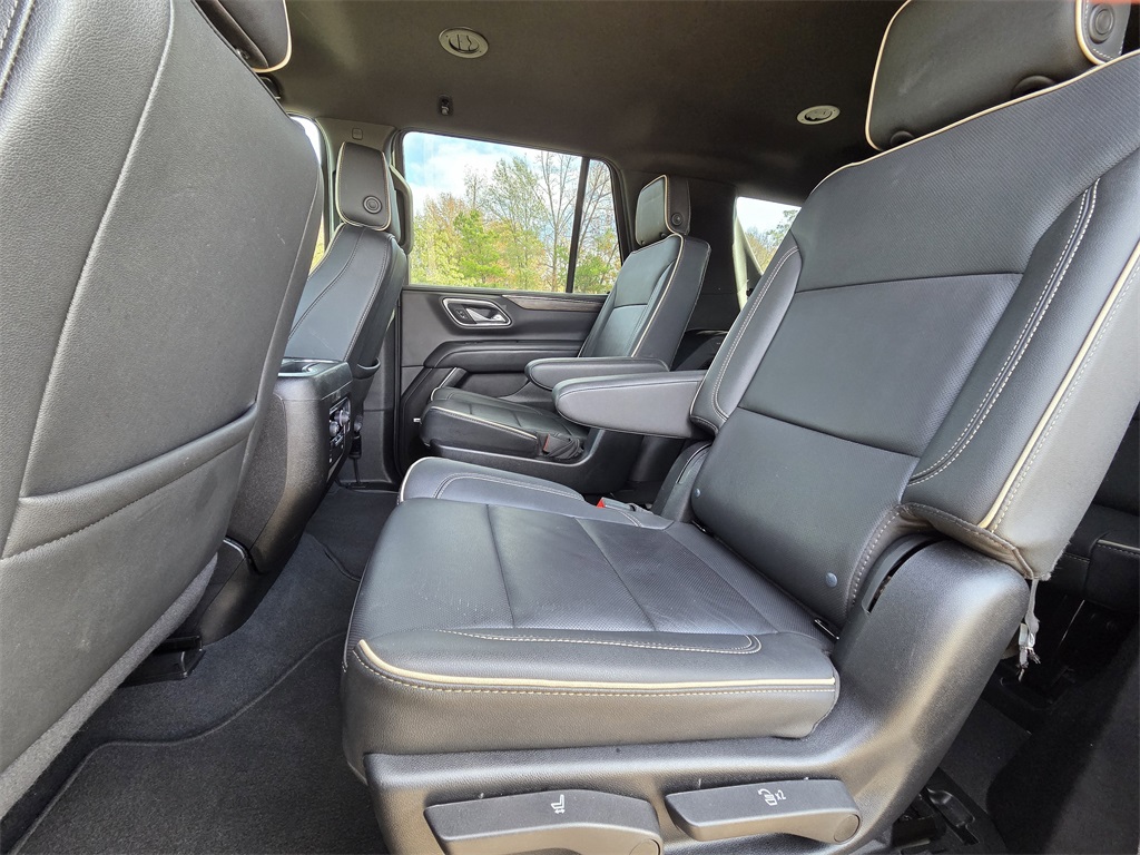 One Owner Trade, 4WD, Black Leather, 10 Speakers, 12-Way Power Driver & Passenger Seat Adjusters, 1st & 2nd Row Color-Keyed Carpeted Floor Mats, 2-Speed Active Electronic AutoTrac Transfer Case, 20" x 9" Polished Aluminum Wheels, 3.23 Rear Axle Ratio, 3rd Row 60/40 Power-Folding Split-Bench Seat, 3rd row seats: split-bench, 4-Wheel Disc Brakes, ABS brakes, Adaptive suspension, Air Conditioning, Alloy wheels, AM/FM radio: SiriusXM with 360L, Apple CarPlay/Android Auto, Auto High-beam Headlights, Auto-dimming door mirrors, Auto-Dimming Inside Rear-View Mirror, Auto-dimming Rear-View mirror, Auto-leveling suspension, Automatic temperature control, Bose 10-Speaker Centerpoint Surround Audio Sys Ft, Brake assist, Bright Front & Rear Door Sill Plates, Bumpers: body-color, Chrome Door Handles w/Body-Color Strip, Chrome Mirror Caps, Color-Keyed Carpeting Floor Covering, Compass, Delay-off headlights, Deleted 3 Years of OnStar Remote Access, Driver & Front Outboard Passenger Airbags, Driver & Front Passenger Heated & Ventilated Seats, Driver door bin, Driver vanity mirror, Dual Exhaust System, Dual front impact airbags, Dual front side impact airbags, Electronic Stability Control, Emergency communication system: OnStar and Chevrolet connected services capable, Enhanced Driver Information Center, Floor Console, Four wheel independent suspension, Front anti-roll bar, Front Bucket Seats, Front Center Armrest, Front dual zone A/C, Front High-Back Reclining Bucket Seats, Front reading lights, Fully automatic headlights, Garage door transmitter, Hands-Free Rear Power Programmable Liftgate, Heated 2nd Row Outboard Seats, Heated door mirrors, Heated Driver & Front Passenger Seats, Heated front seats, Heated rear seats, Heated Steering Wheel, Heated steering wheel, Hill Descent Control, Illuminated entry, Infotainment Display, Lane Change Alert w/Side Blind Zone Alert, LED Daytime Running Lamps, Low tire pressure warning, Magnetic Ride Control Suspension, Memory seat, Memory Settings, Navigation System, Occupant sensing airbag, Outside Heated Power-Adjustable Mirrors, Outside temperature display, Overhead airbag, Overhead console, Panic alarm, Passenger door bin, Passenger vanity mirror, Perforated Leather Seat Trim, Power door mirrors, Power driver seat, Power Liftgate, Power passenger seat, Power Release 2nd Row Bucket Seats, Power steering, Power Tilt & Telescopic Steering Column, Power windows, Preferred Equipment Group 1LZ, Premium audio system: Chevrolet Infotainment 3 Premium, Radio: Chevrolet Infotainment 3 Premium System, Rain sensing wipers, Rear air conditioning, Rear anti-roll bar, Rear Cross Traffic Alert, Rear reading lights, Rear window defroster, Rear window wiper, Remote keyless entry, Remote Start, Roof rack: xxxxxx, Safety Alert Seat, Security system, SiriusXM w/360L, Speed control, Speed-sensing steering, Split folding rear seat, Spoiler, Steering wheel memory, Steering wheel mounted audio controls, Tachometer, Telescoping steering wheel, Tilt steering wheel, Traction control, Trip computer, Turn signal indicator mirrors, Universal Home Remote, Variably intermittent wipers, Ventilated front seats, Voltmeter, Wireless Charging, Wrapped Steering Wheel.